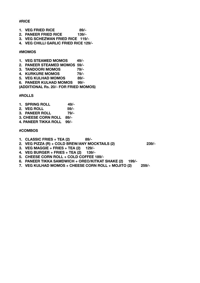 - Rice Dishes: Indulge in delectable fried rice varieties starting from ₹89, ensuring there’s something for everyone.